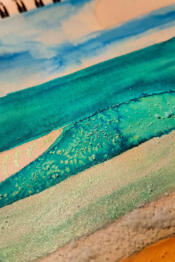 Ich las noch ein zweites Buch im August. Auf Instagram habe ich 25 letzte Sommer von Stephan Schäfer für dich rezensiert. Und ich habe schon wieder eine neue App in mein Herz geschlossen. Sie nennt sich Praktika. Damit spreche ich mit KI-„Menschen“ englisch und französisch. Das macht sehr viel Spaß und ich poliere nebenbei meine Fremdsprachenkenntnisse auf. Ach ja: Ich begann ein Bild zu malen. Motiv: Das Meer – wa sonst ;-). Es ist ein Aquarell und ich krümelte Salz darüber für spannende Effekte.