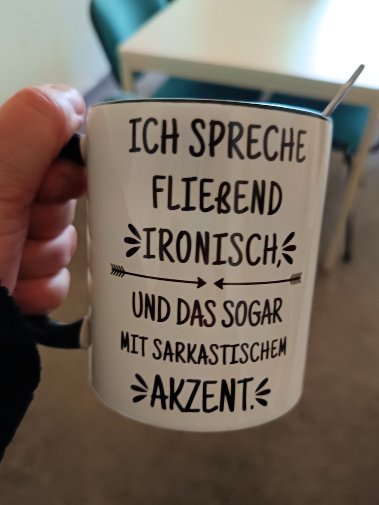 Ich habe zu meinem Geburtstag eine Tasse von einer Kollegin geschenkt bekommen, auf der sinngemäß steht, dass ich ironisch und sarkastisch bin. Und das stimmt! Auf Arbeit rede ich spitz und werfe Bemerkungen in den Raum, die man nicht ganz ernst nehmen sollte, manchmal auch sehr spontan. Ich merke dabei oft gar nicht, wie sehr das Teil meines Umgangs geworden ist, wie selbstverständlich diese Art zu sprechen für mich ist.